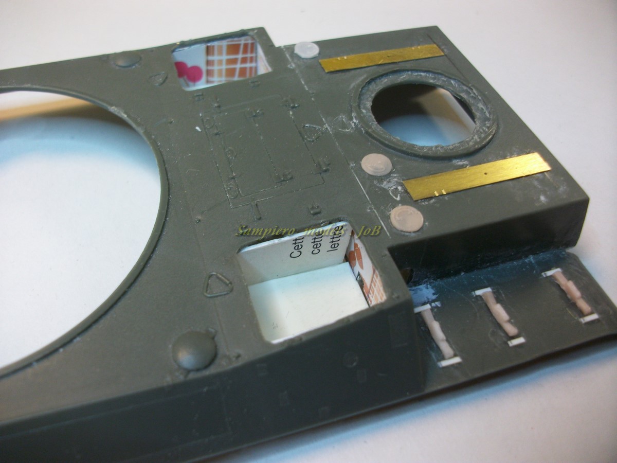 Une plaque de protection ( résine ) est fixé devant la trappe du tireur et un tire-fort ( résine) est mise en place sur l'anneau arrière de la tourelle.