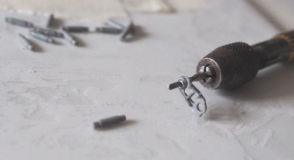 A ce stade on met une très très très légère pointe de colle normale sur la tête de l'axe pour faire tenir les guides, il faut enlever le surplus de colle en s'assurant que tout soit mobile! Seul le dernier est libre au cas ou il y a un problème quelconque . On met tout çà de côté à l'abri pour préparer les trains de roulement : les photos parlent d'elles-même. Quand on colle les plaques sur les guides cela devient fastidieux.